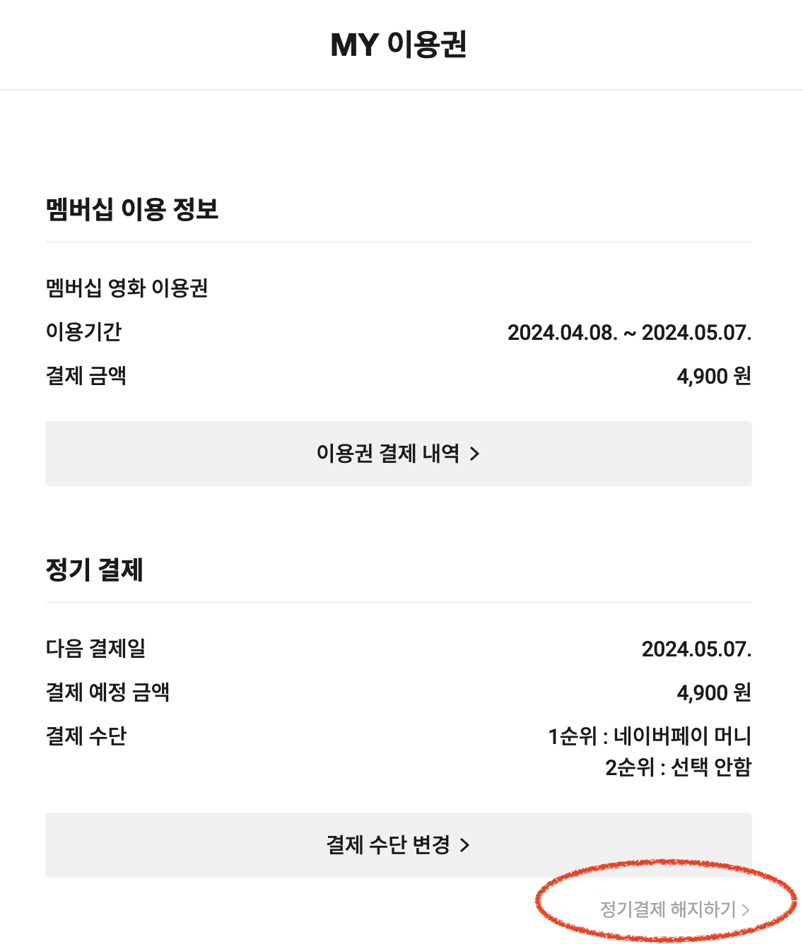 4.MY이용권 > 하단에 있는 정기결제 해지하기 클릭